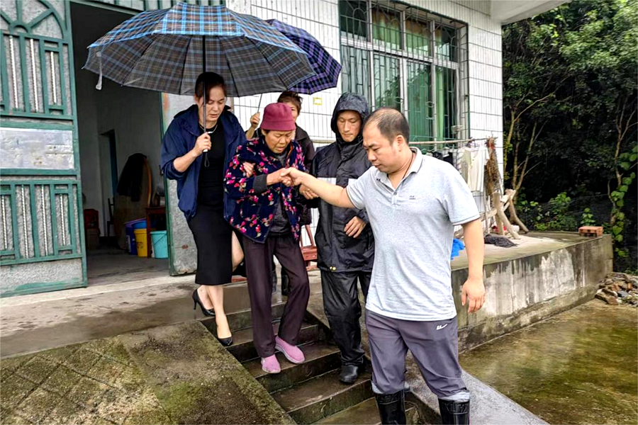 前几日,刚下暴雨时,木塘垸镇人大主席罗彬得知正洪社区70多岁的熊奶奶家因年久失修,紧靠地质灾害点,存在垮塌风险,便立即带队驱车前往准备展开救助进行转移。在老人家门口,本就有着青苔的台阶在大雨过后更为湿滑,趁雨势较小的时候,罗彬身着雨衣,小心谨慎地搀扶着老太太进行紧急撤离,在众人的努力下,熊奶奶夫妻二人被顺利转移到村委会附近的安置点。经过两天的紧急转移,木塘垸镇17户60名群众全部安全撤离,保障了群众生命财产安全。