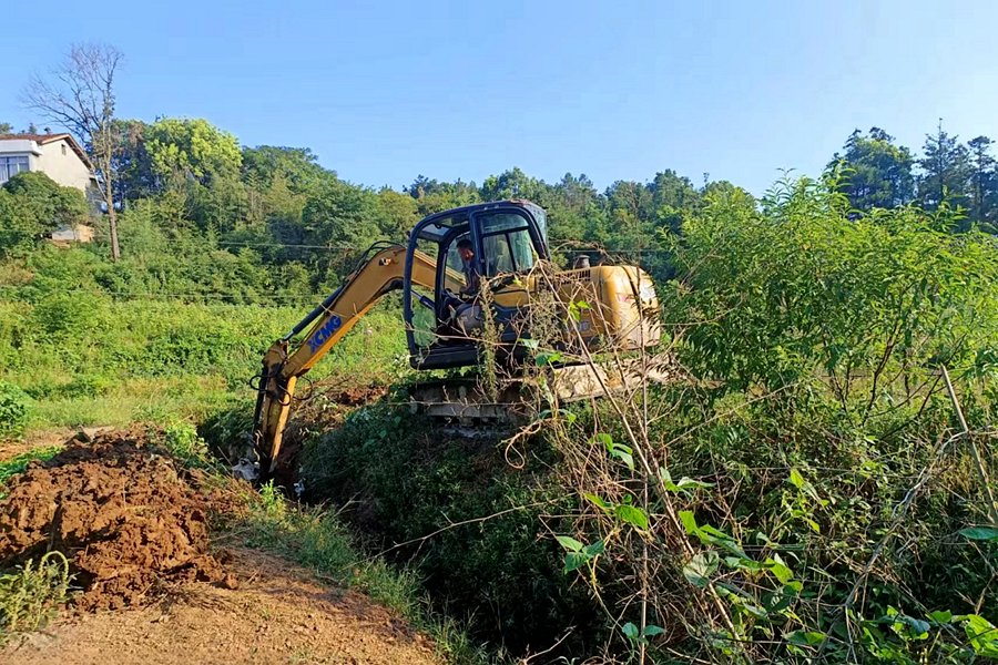 聚宝山村租用挖掘机对支渠进行清淤扫障