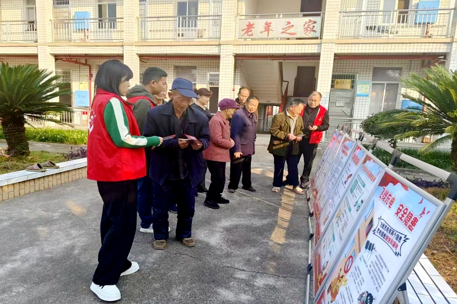 “气温骤降,大家在家中使用空调、电热毯、烤火炉时要注意安全用火、用电、用气,人离开要熄灭火源,出门时要关掉电源、气源……”在剪市集镇上,志愿者们正在向过往群众讲解消防安全知识。