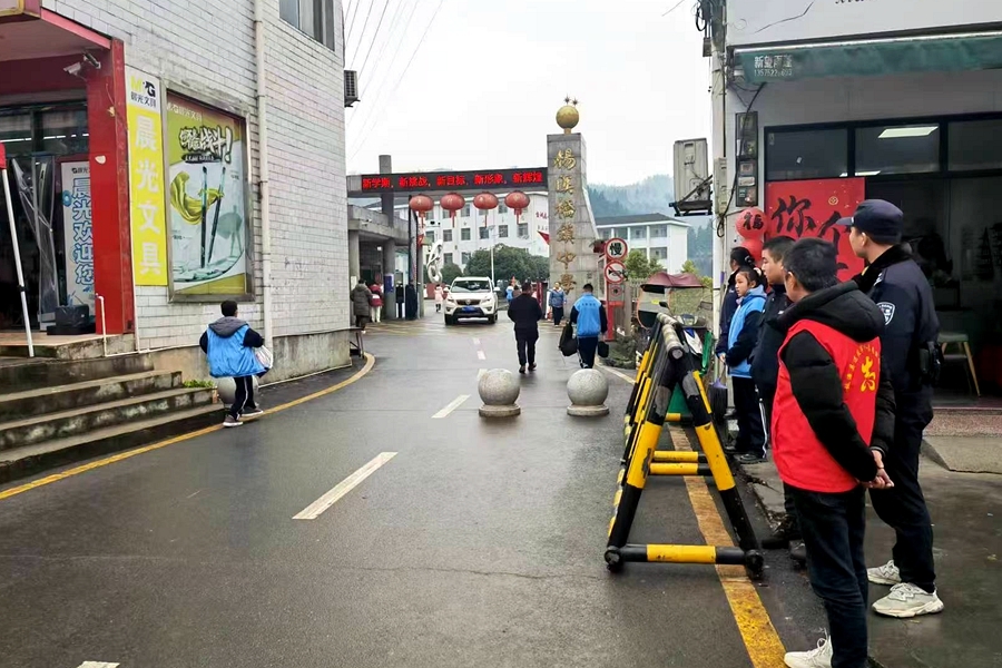 2月12日,杨溪桥镇党委政府调度镇社综、退役军人服务站联合镇派出所在杨溪桥镇中学开展护校安园行动,切实保障了辖区内中小学生交通安全,全力守护师生平安出行路。