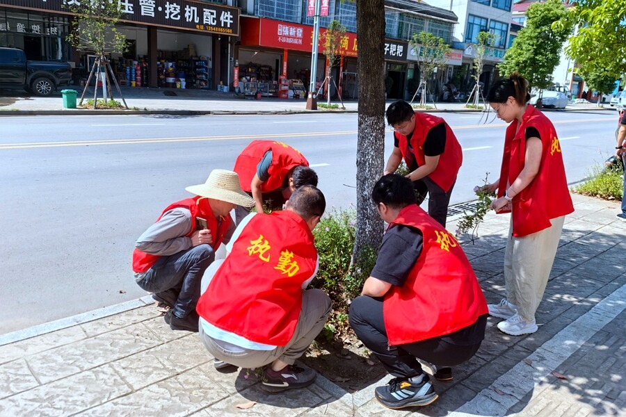 茶庵铺镇干部年轻干部清理街道绿化带杂草