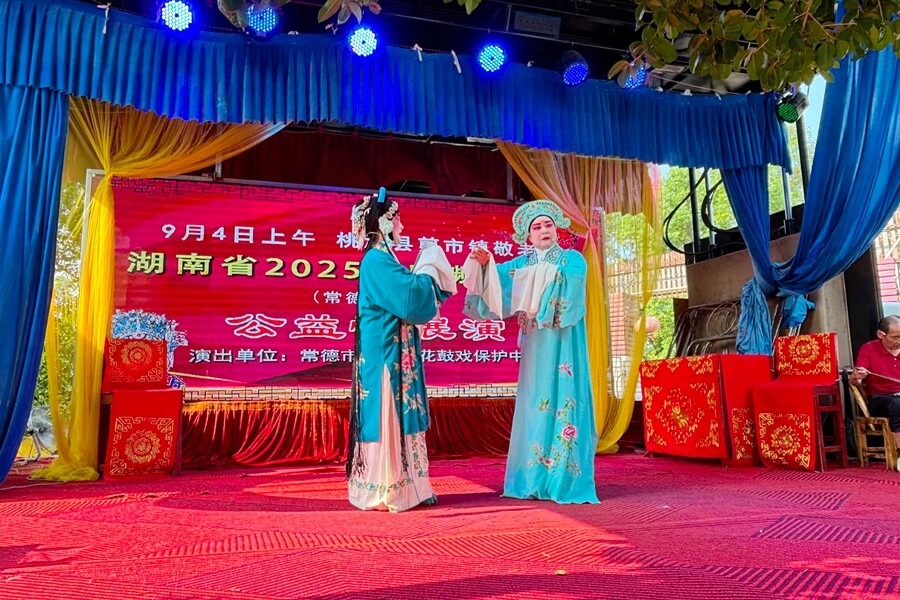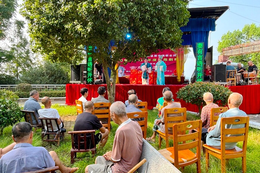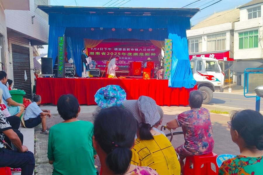 9月4日,剪市镇敬老院内热闹非凡,院内的老人、闻讯赶来的附近村民围坐一团,兴致勃勃地观看着送戏下乡的节目,这是由常德市鼎城区花鼓戏保护中心公益性展演非遗戏剧带来的花鼓戏表演《孟日红割股》。