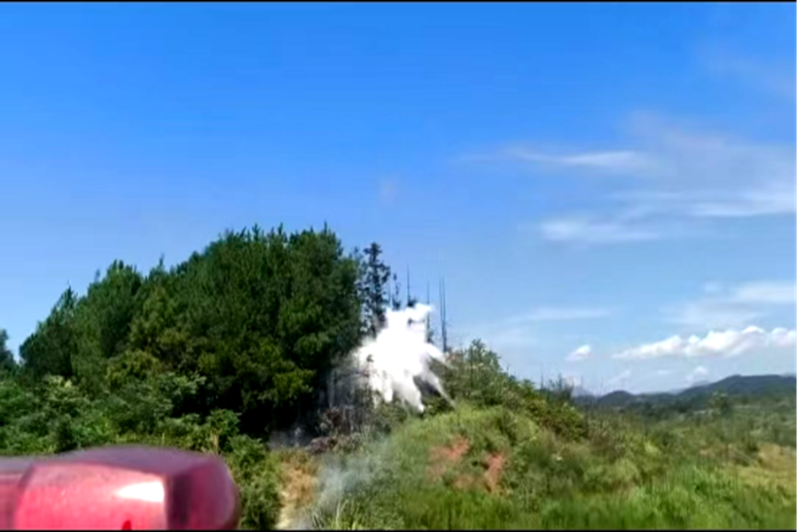在应急演练现场,一架工业级无人机携载灭火弹呼啸升空,精准飞抵模拟火点上空。随着指令下达,经过两轮精准投弹,灭火弹瞬间覆盖火场核心区域,明火得到快速压制。这套“空对地”精准扑救模式,成为黄石镇今年森林防灭火备战工作的创新举措。