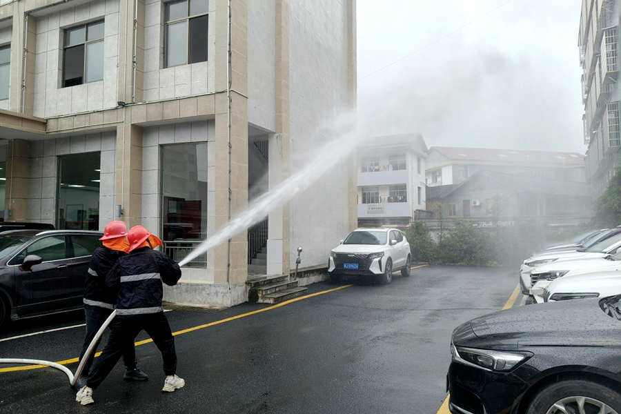 演练正式启动后,随着现场指挥长一声令下,应急救援队伍迅速响应、有序组织、默契配合,快速铺设高压水泵,进行水带连接,首先利用水炮设备对远处“火点”进行精准喷射扑救,压制“火头”,随后使用高压细水雾灭火机清理近处“余火”,整个演练过程紧张有序,有效提升了应急救援队伍良好的战术素养和协同作战能力。