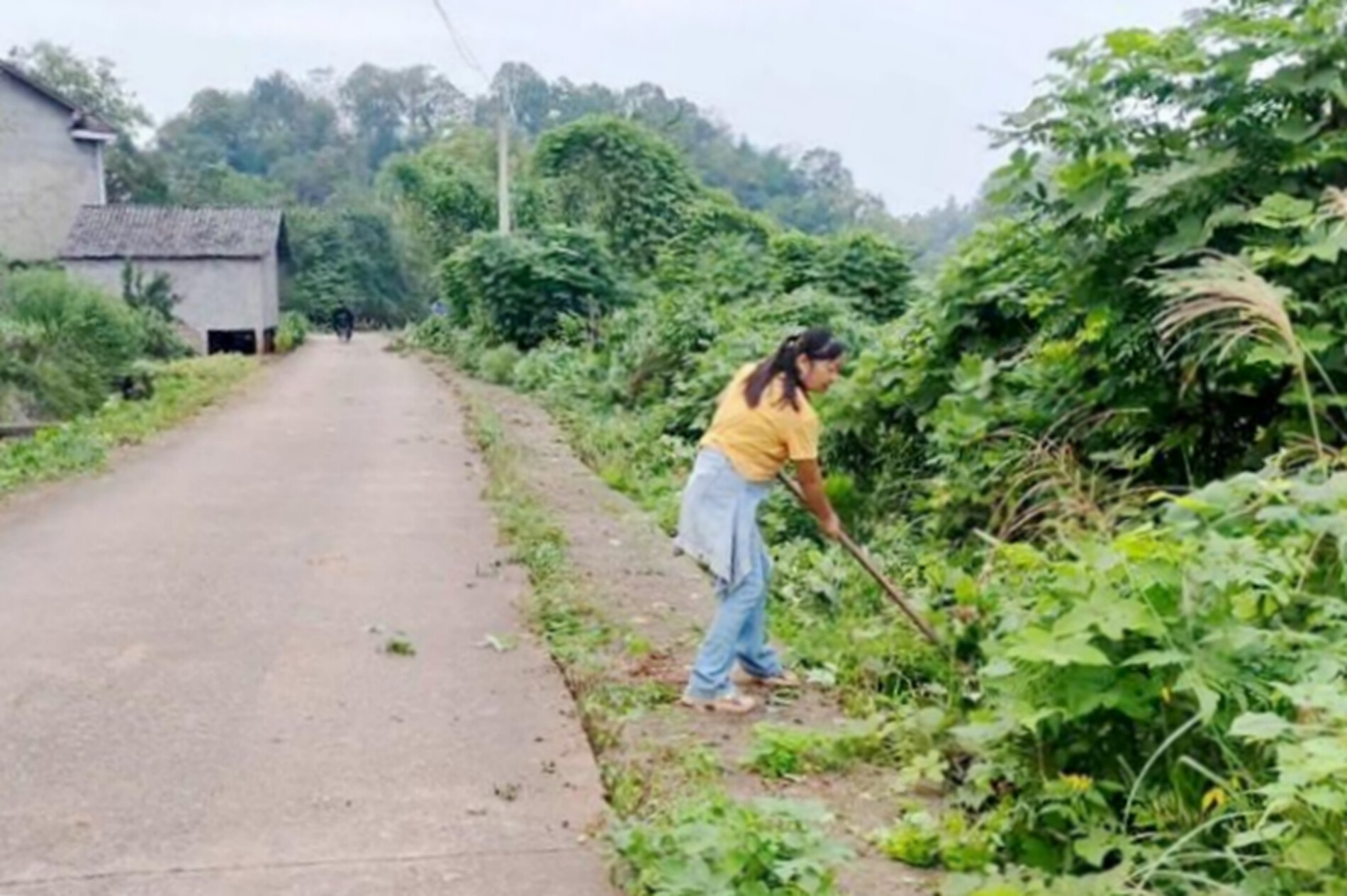 道路两旁进行砍草除杂