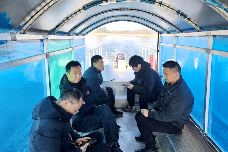一行人乘船寻找秋沙鸭
