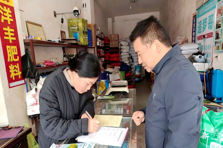 工作人员在农资店进行安全检查