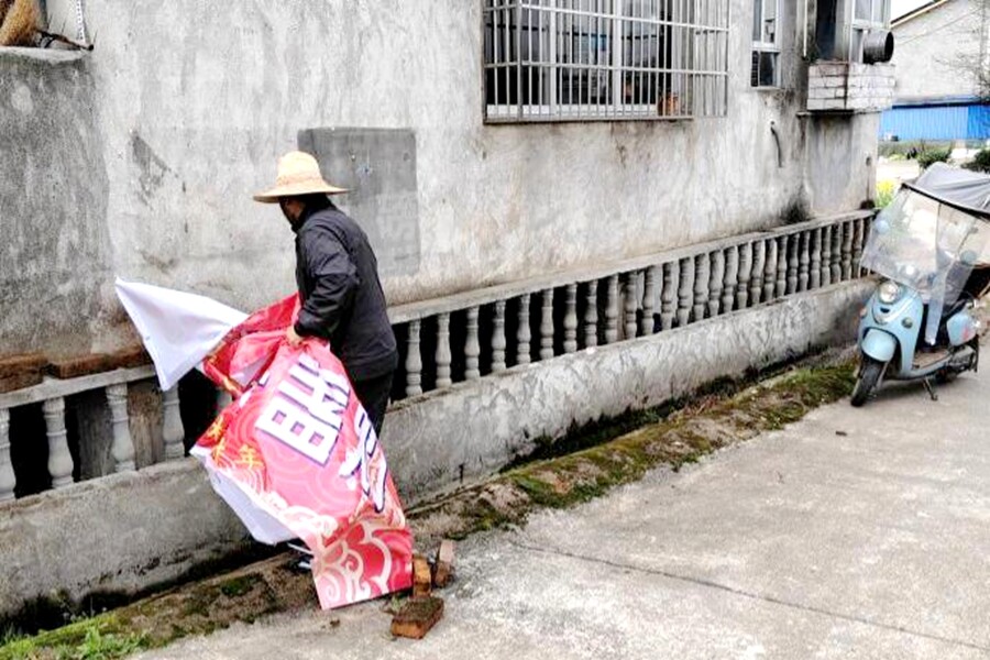 新店驿一村民清理自家墙壁被粘贴的广告