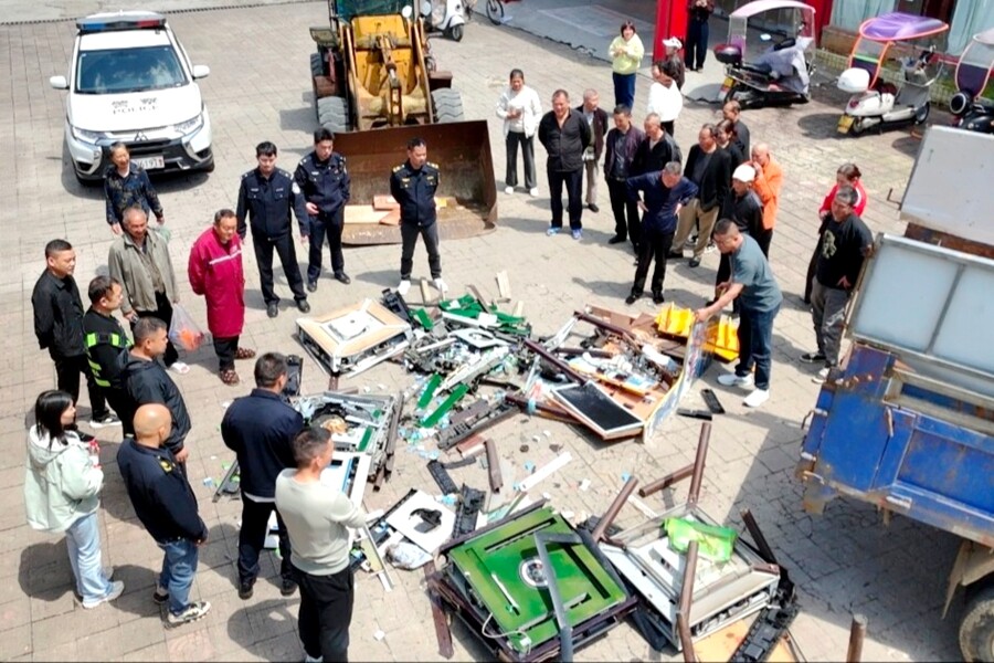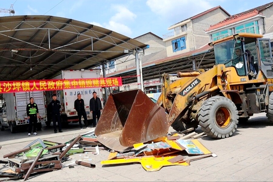 “哐——”随着推土机铲斗重重落下,一台麻将机瞬间四分五裂,围观群众中随即响起一阵叫好声。4月23日上午,沙坪镇农贸市场内,执法人员对近期收缴的5台麻将机和1台赌博游戏机进行集中销毁,以实际行动彰显该镇深化经营性棋牌室专项整治、严厉打击赌博行为的坚定决心。