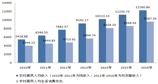 (一)收入水平快速增长促进消费水平大幅提高。居民收入是影响消费的最主要因素,消费水平随着收入的增长而增长,具有高度的正相关。从图4可以看出,桃源农村居民收入和消费支出呈现同步增加的趋势。农村居民人均纯收入从2010年的5418.88元增加到2012年的7682.57元,增长41.8%,消费支出也随2010年的3946.13元增加到4715.91元,增长19.5%。农民人均可支配收入从2013年的9192.17元增加到2016年的12260.86元,增长33.4%,消费支出也随之从2013年的5666.74元增加到9587.34元,增长69.2%。