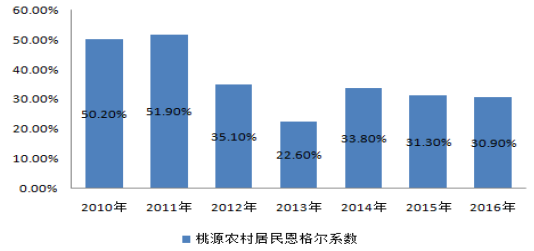 (三)生活水平不断改善。全县农村居民的恩格尔系数从2010年的50.2%下降到了2016年的30.9%,其中2013年甚至下降到了22.6%(如图3)。根据恩格尔系数的标准,已达到富裕的级别。从现实生活看,农村居民重建或重新装修房屋已成常态,家用耐用品不再局限彩电、冰箱、洗衣机,空调、消毒柜、太阳能热水器、空气能热水器、抽油烟机、净水机等等都已是寻常百姓家庭的标配,手机早已进入千家万户,家用汽车拥有量也逐年增加,旅游、文化等第三产业类消费将成为农村居民消费增长的一个热点。