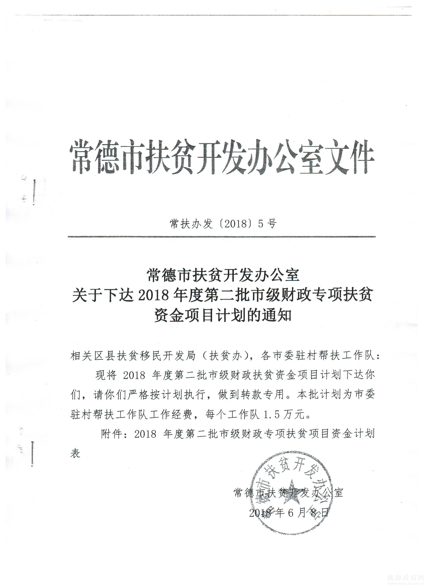 常德市扶贫开发办公室关于下达2018年度第二批市级财政专项扶贫资金项目计划的通知
