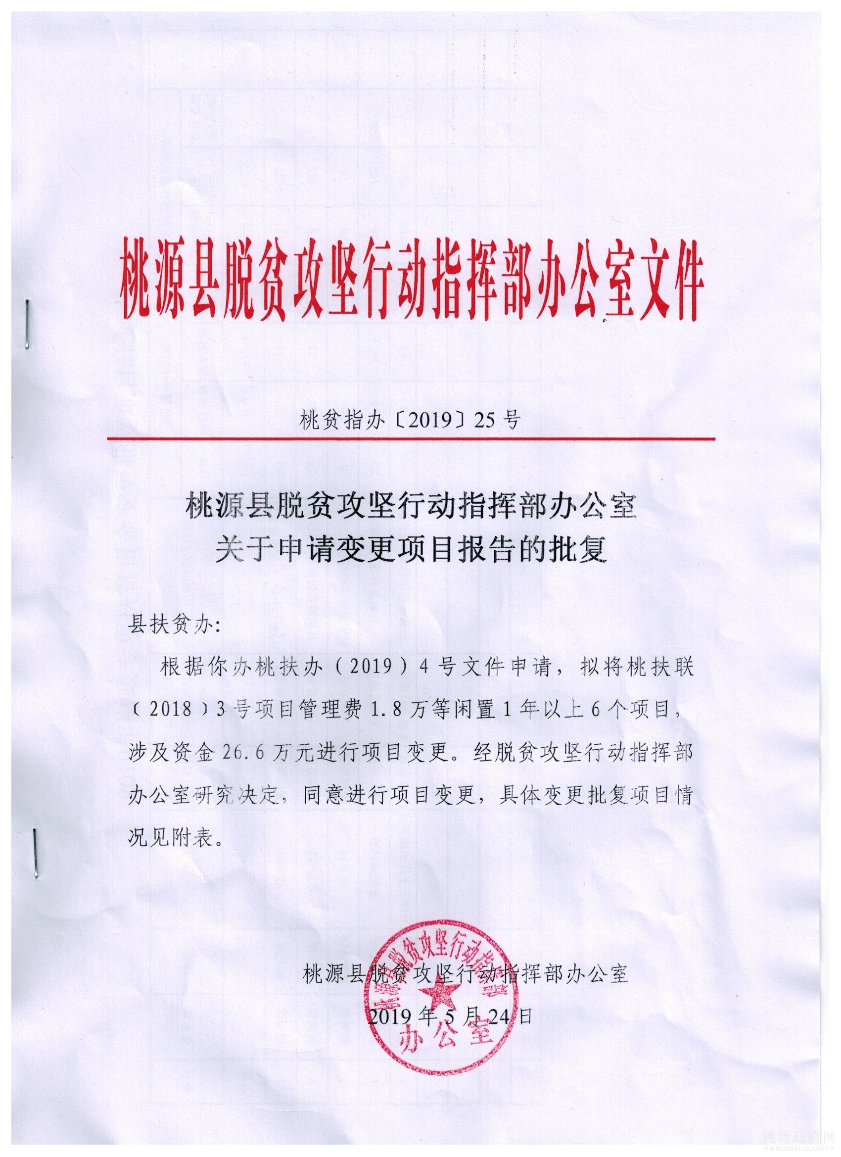 桃贫指办(2019)25号 关于申请变更项目报告的批复