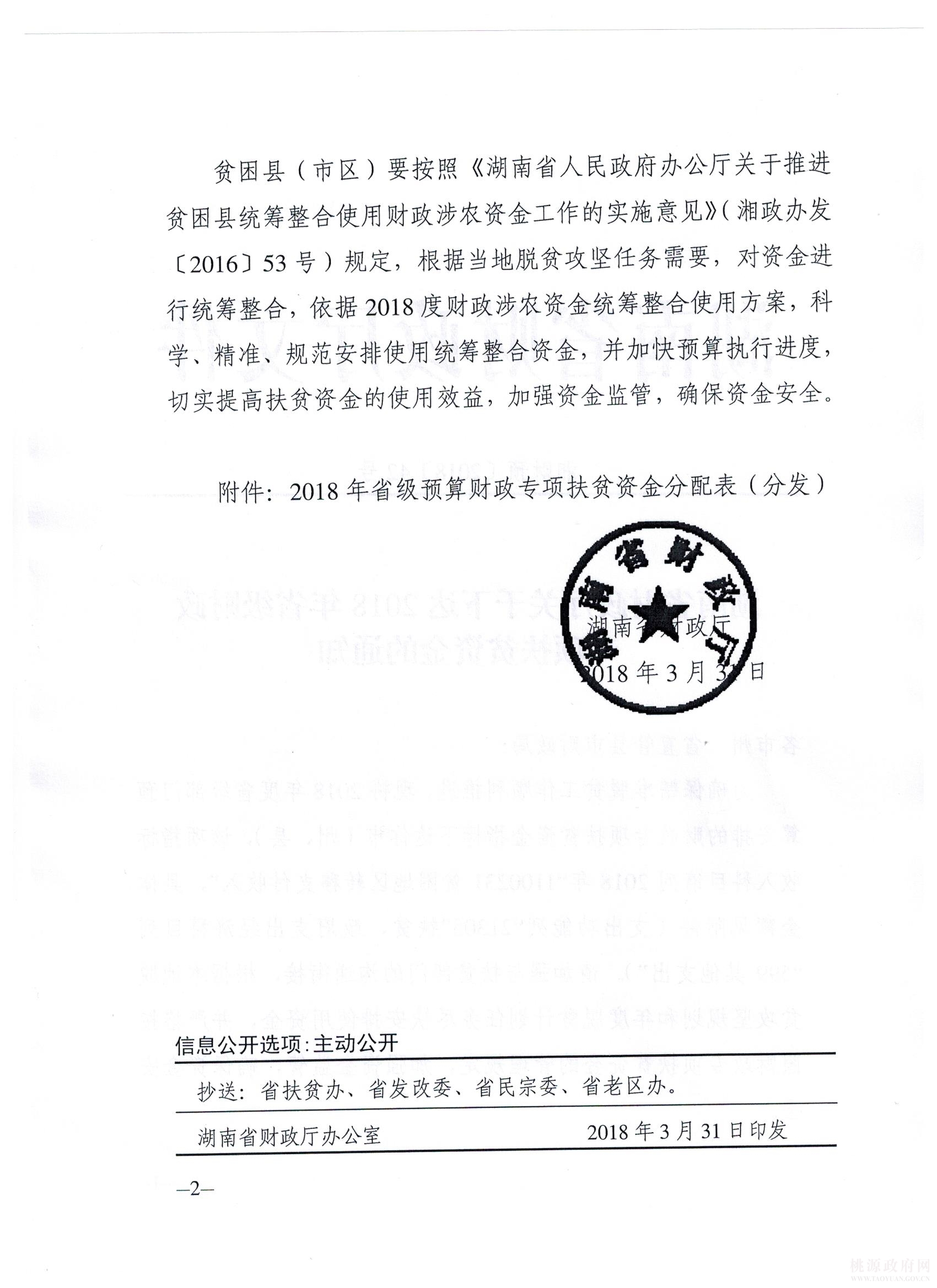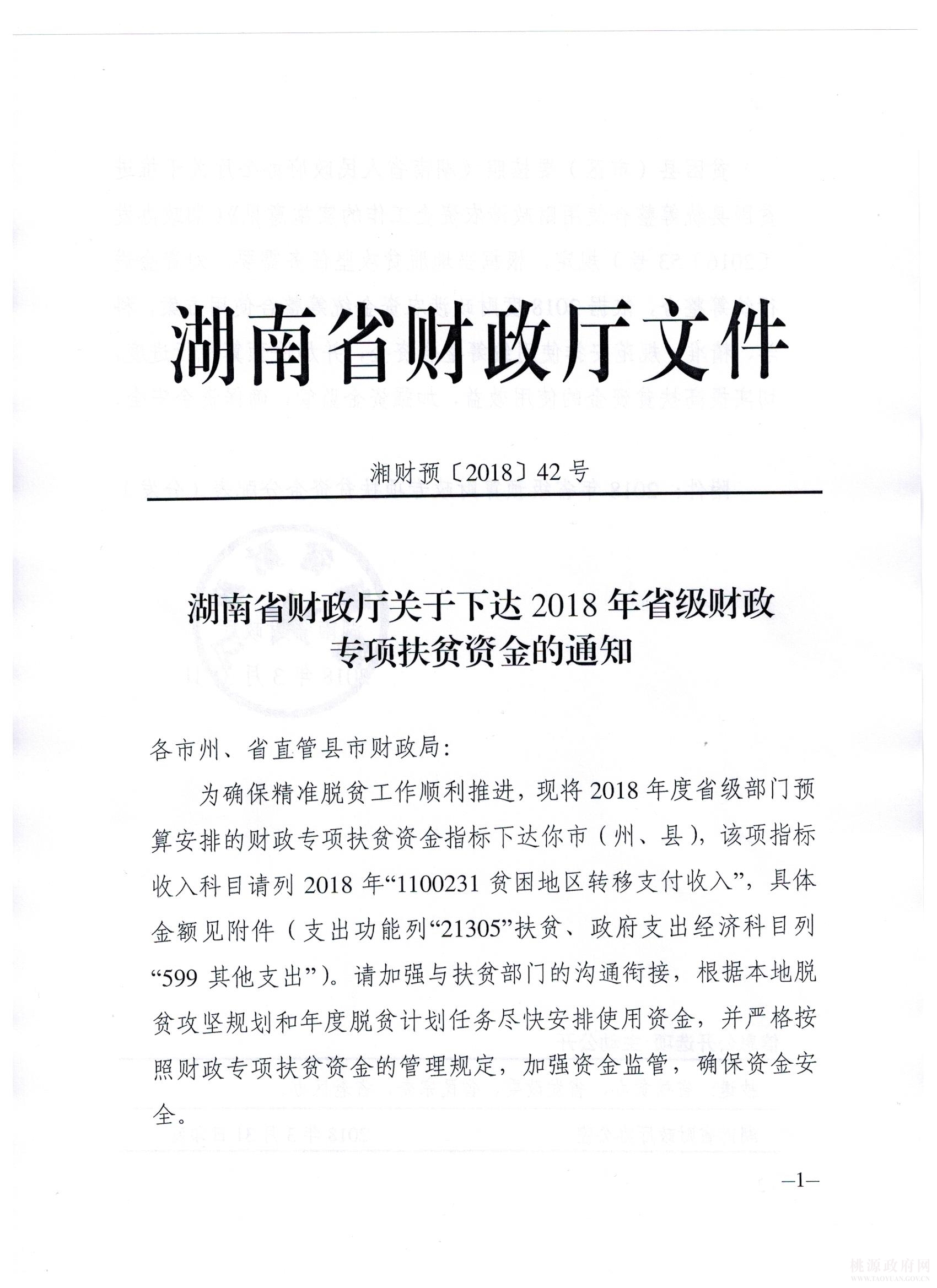 转湖南省财政厅关于下达2018年省级财政专项扶贫资金的通知