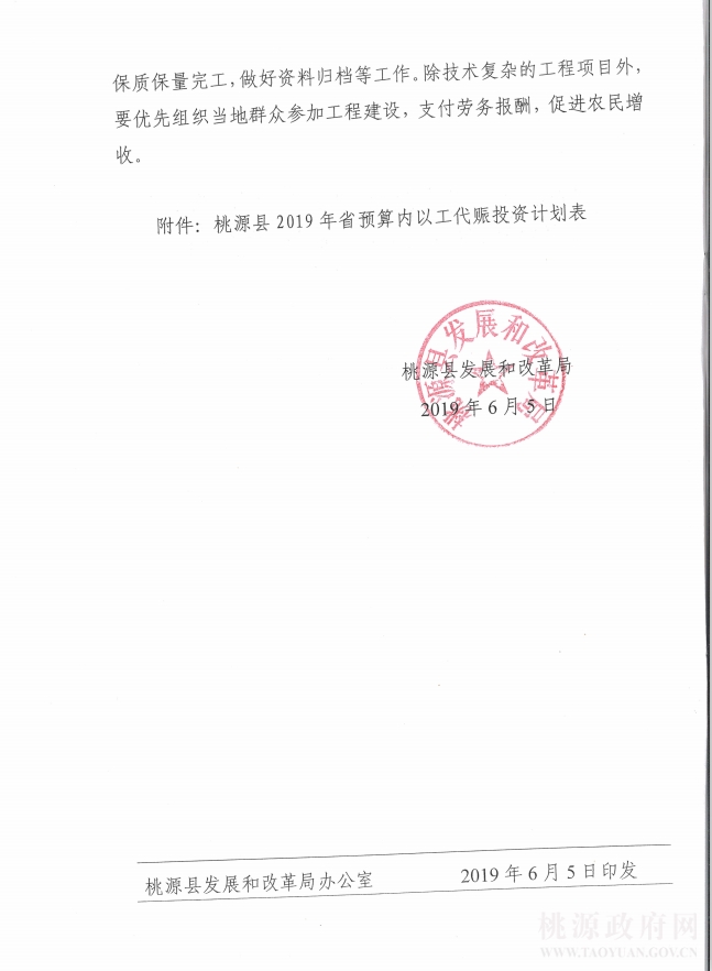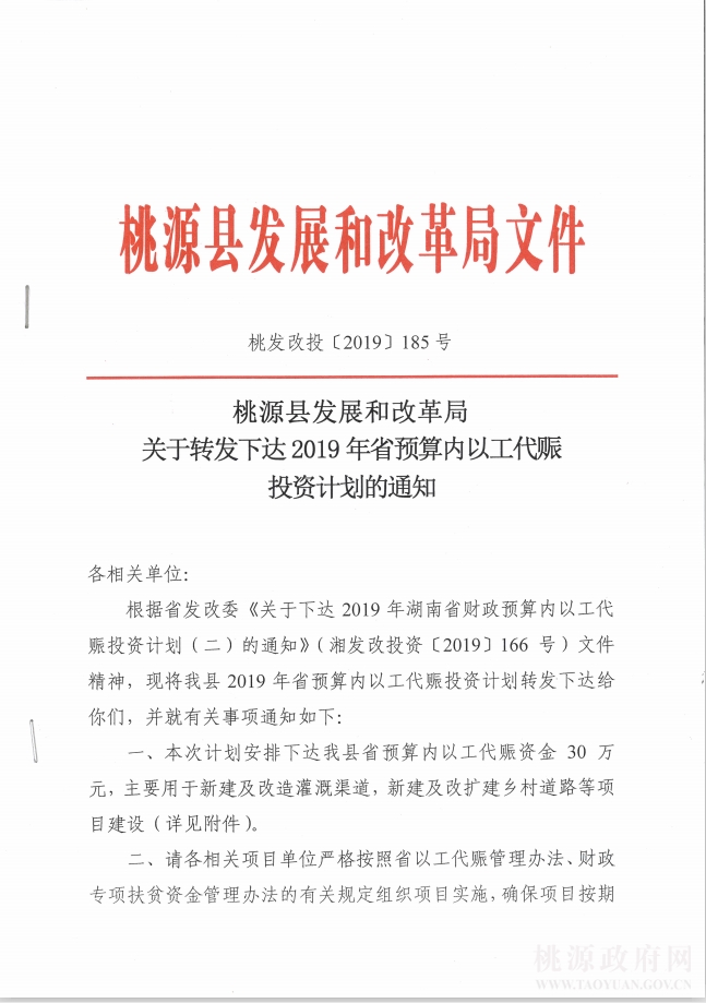 桃发改投(2019)185号 关于转发下达2019年省预算内以工代赈投资计划的通知