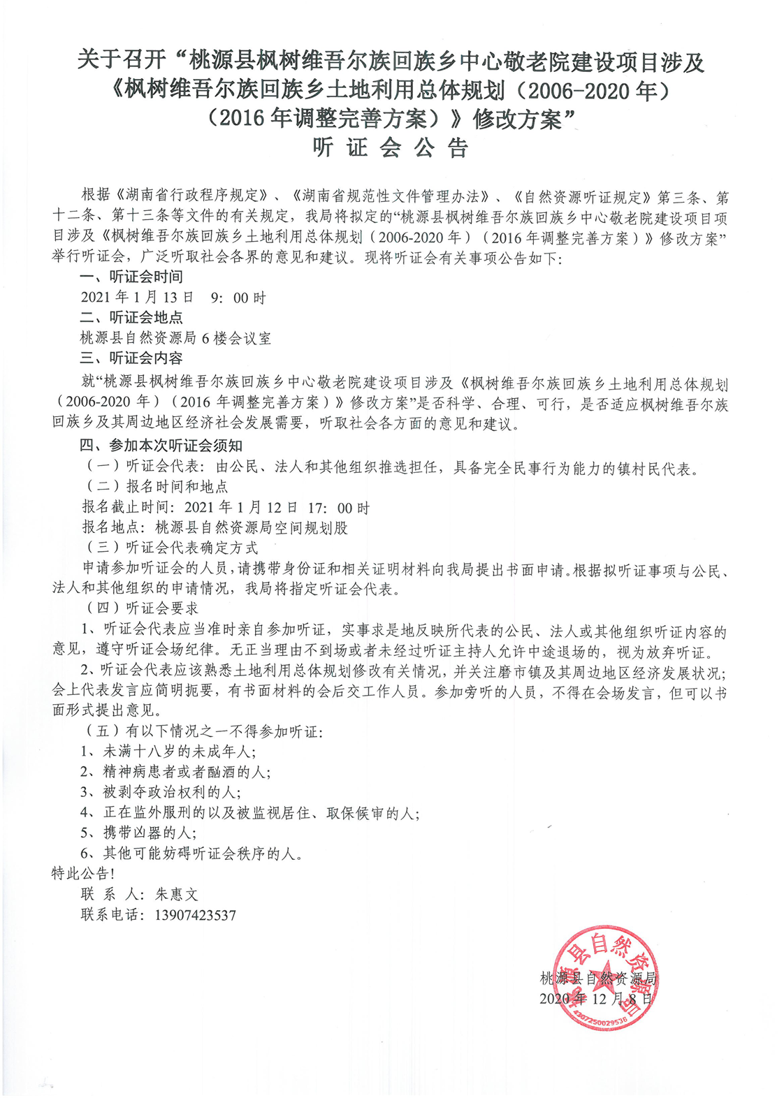 桃源县枫树维吾尔族回族乡中心敬老院建设项目涉及《枫树维吾尔族回族乡土地利用总体规划(2006-2020年)(2016年调整完善方案)》修改方案听证会公告