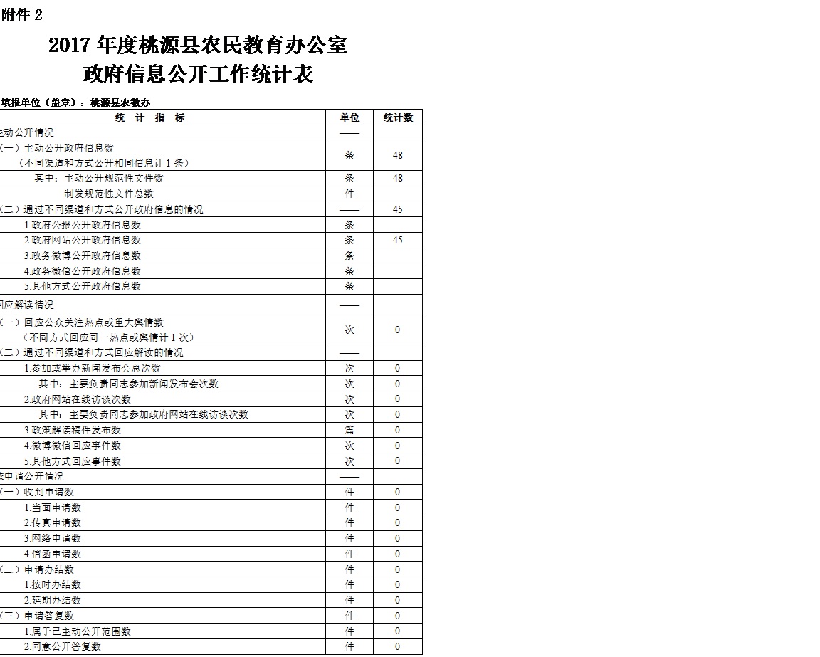 根据《条例》要求,2017年进一步加强政府信息公开工作。为此,专门配备了1名兼职工作人员,设立了政务公开工作办公室、信息申请受理点。截至2017年底,桃源县农教办政府信息公开工作运行正常,政府信息公开咨询、申请和答复工作顺利开展。
