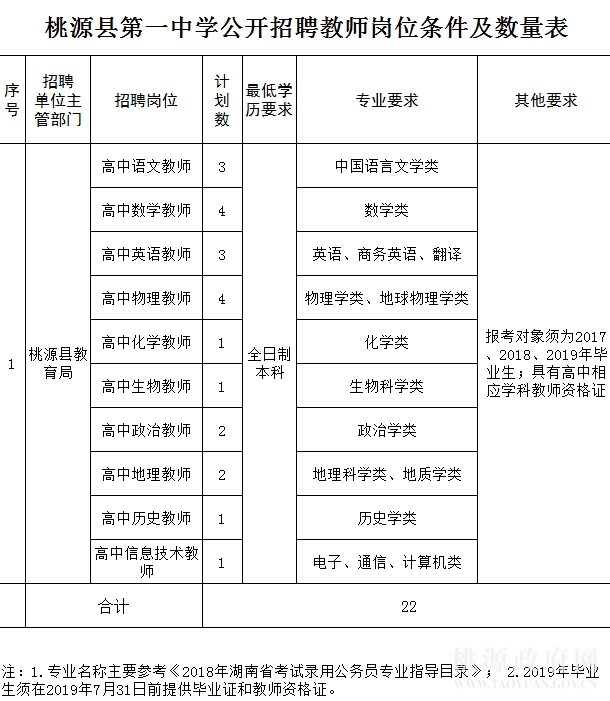 1.桃源第一中学公开招聘教师岗位条件及数量表