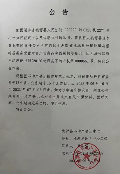 关于不动产证书 湘(2019)桃源县不动产权第0000661号 作废的公告