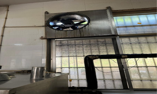 存在的隐患:排气扇纱罩脱落,未及时更换。