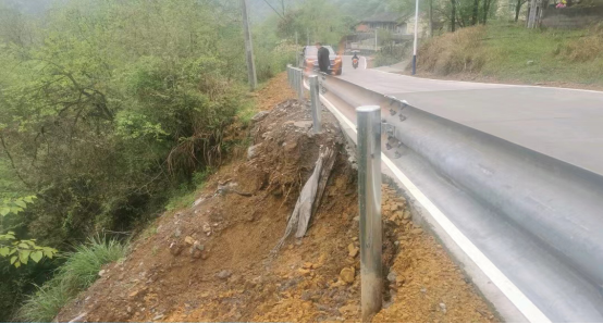 存在的隐患:公路K167+536—K167+556处,因雨水冲刷、浸泡导致公路左侧路基边坡滑坡,路基外侧冲空、路面脱空,护栏立柱裸露无支撑,严重减弱了公路防护能力,存在较大安全隐患。