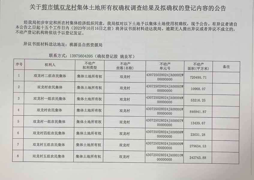 关于剪市镇双龙村集体土地所有权确权调查结果及拟确权的登记内容的公告