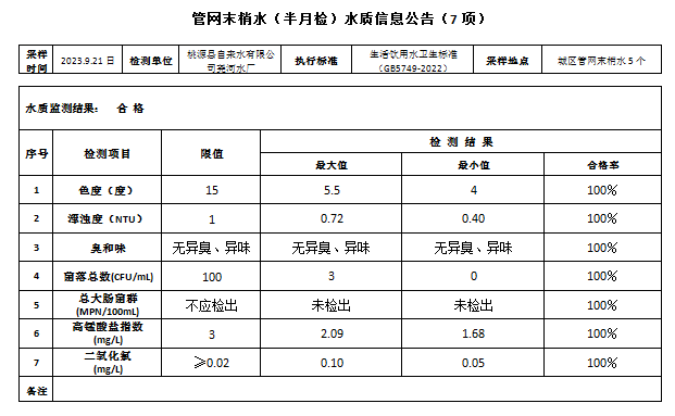 桃源县城管网末梢水检测报告(9月21日)