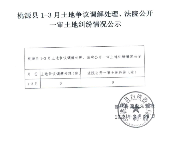 桃源县1-3月土地争议调解处理、法院公开一审土地纠纷情况公示