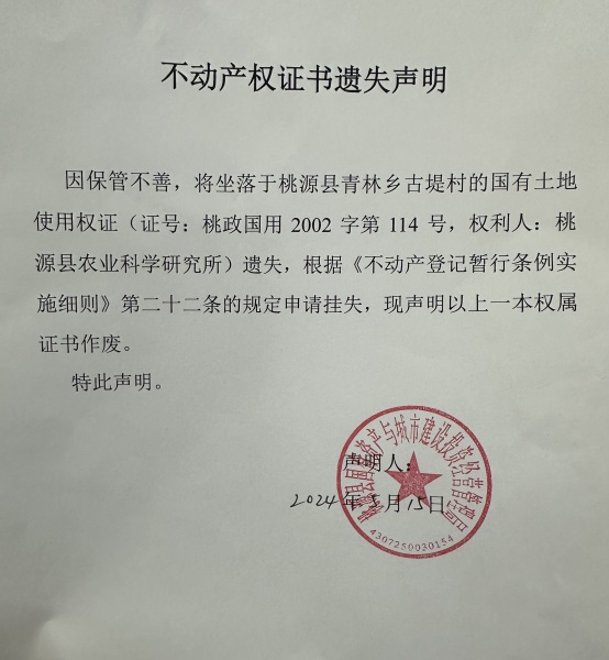 不动产权属证书遗失声明-桃源县农业科学研究所