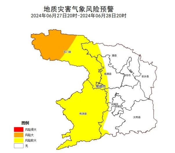根据地质灾害成灾规律和孕灾条件及短期气象预报情况,常德市自然资源和规划局与常德市气象局联合发布地质灾害气象风险橙色、黄色预警:6月27日20时至6月28日20时,石门县西部发生突发性地质灾害的风险高(橙色预警),石门县、澧县西部、临澧县西部、桃源县、鼎城区西部、常德高新区发生突发性地质灾害的风险较高(黄色预警)。