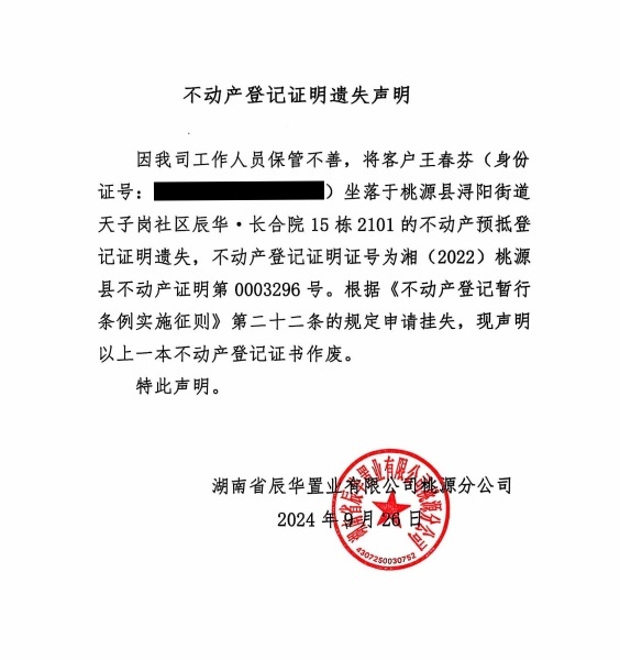不动产他项权属证书遗失声明-王春芬