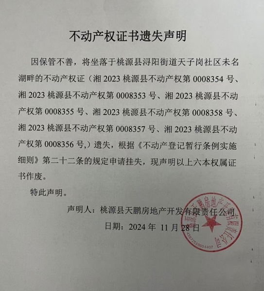 不动产权属证书遗失声明-桃源县天鹏房地产开发有限责任公司