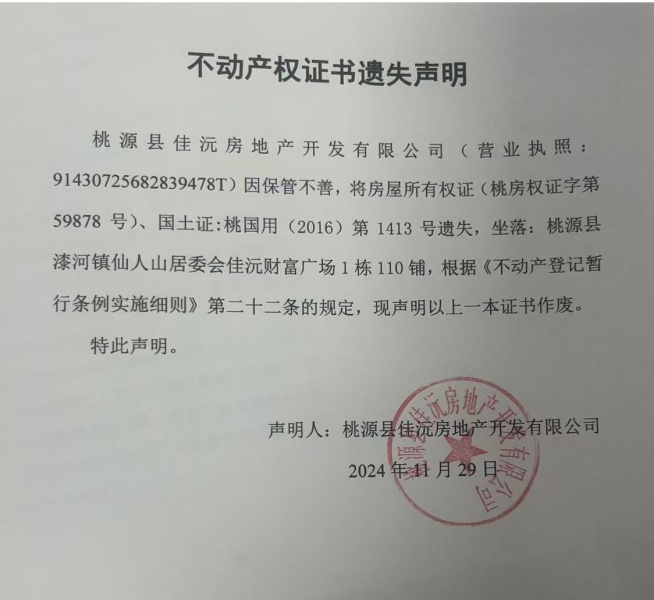 不动产权属证书遗失声明-桃源县佳沅房地产开发有限公司