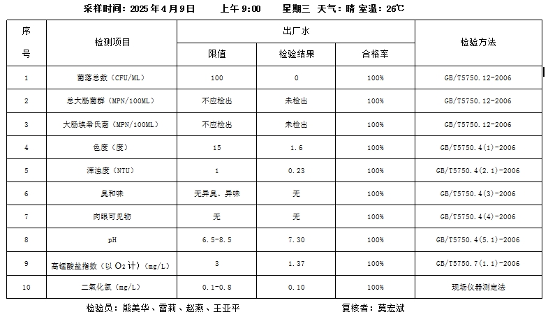 县城区2025年4月9日水质检测报告
