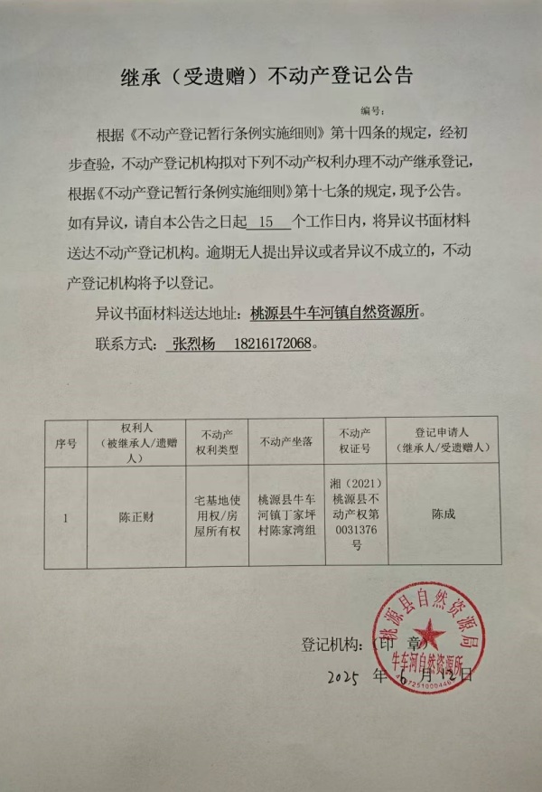 不动产继承登记公示-陈正财