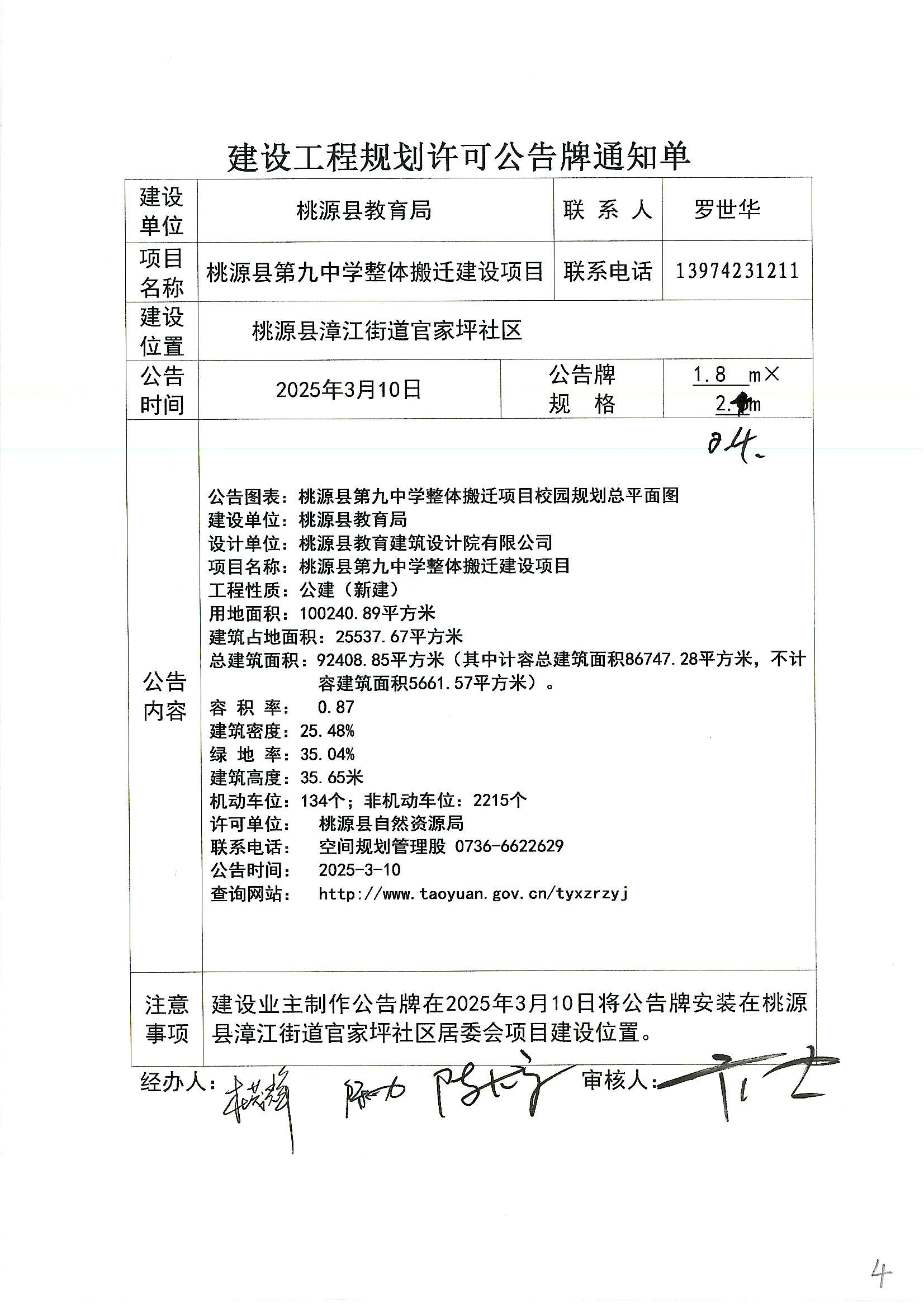 建设工程规划许可公告牌通知单-桃源县第九中学整体搬迁项目