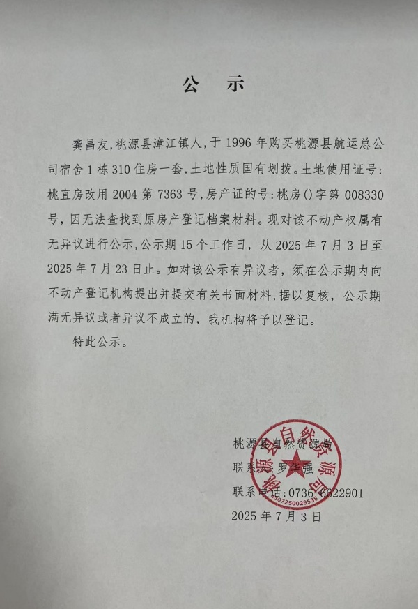 关于对龚昌友房屋所有权证、土地使用权证的有关事项公示