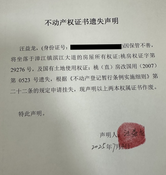 不动产权属证书遗失声明-汪益龙