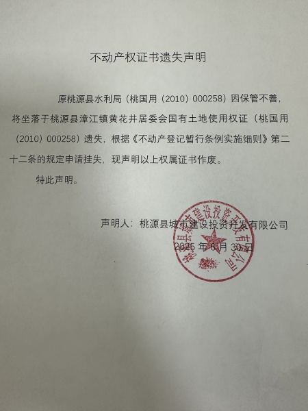 不动产权属证书遗失声明-桃源县城市建设投资开发有限公司