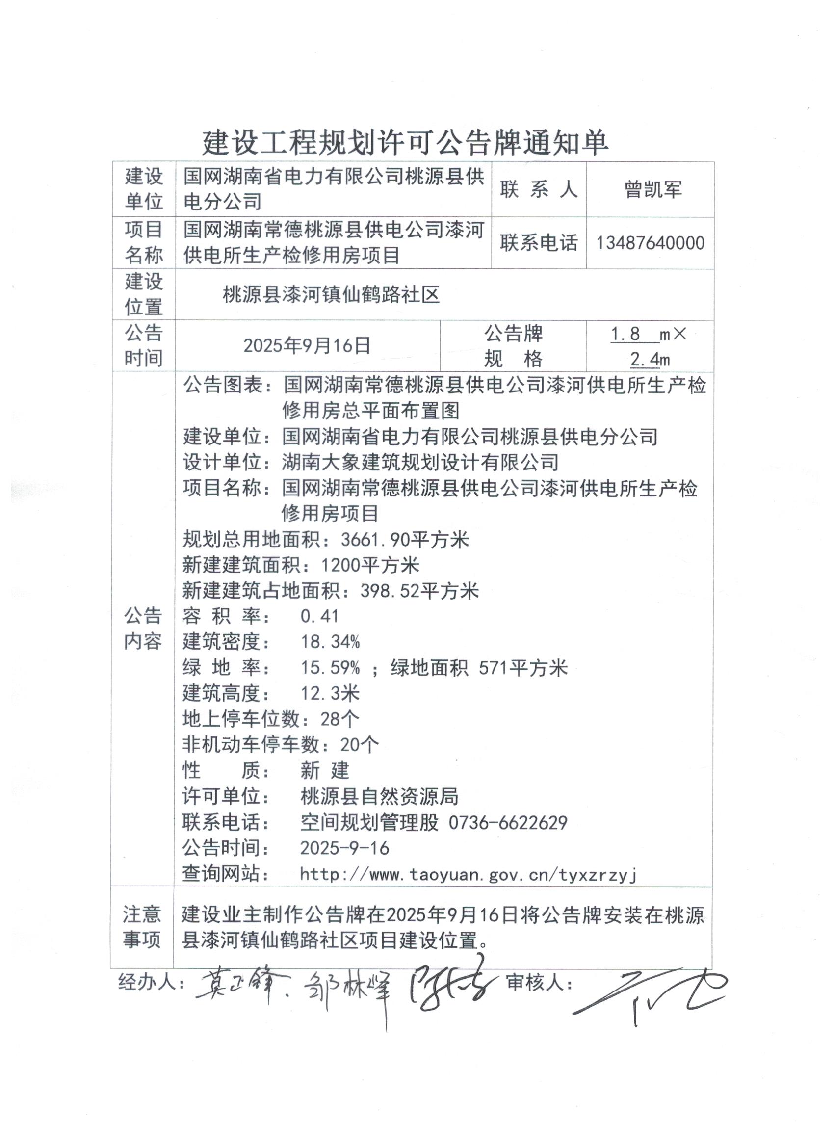 建设工程规划许可公告牌通知单-国网湖南常德桃源县供电公司漆河供电所生产检修用房项目