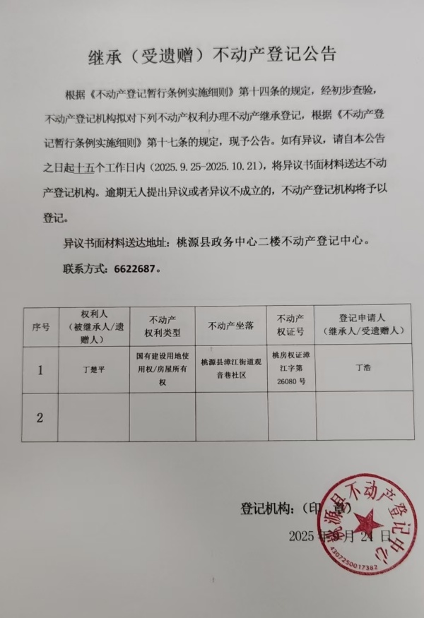 不动产继承登记公示-丁楚平
