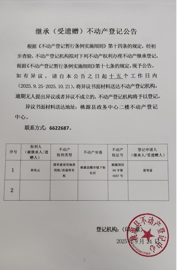 不动产继承登记公示-孙先云