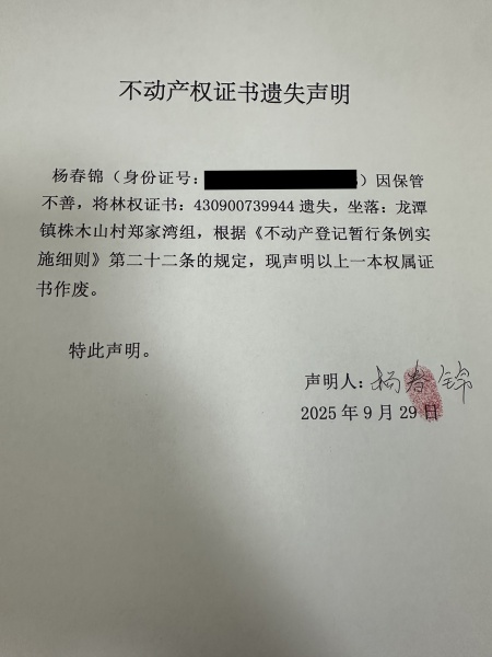 不动产权属证书遗失声明-杨春锦