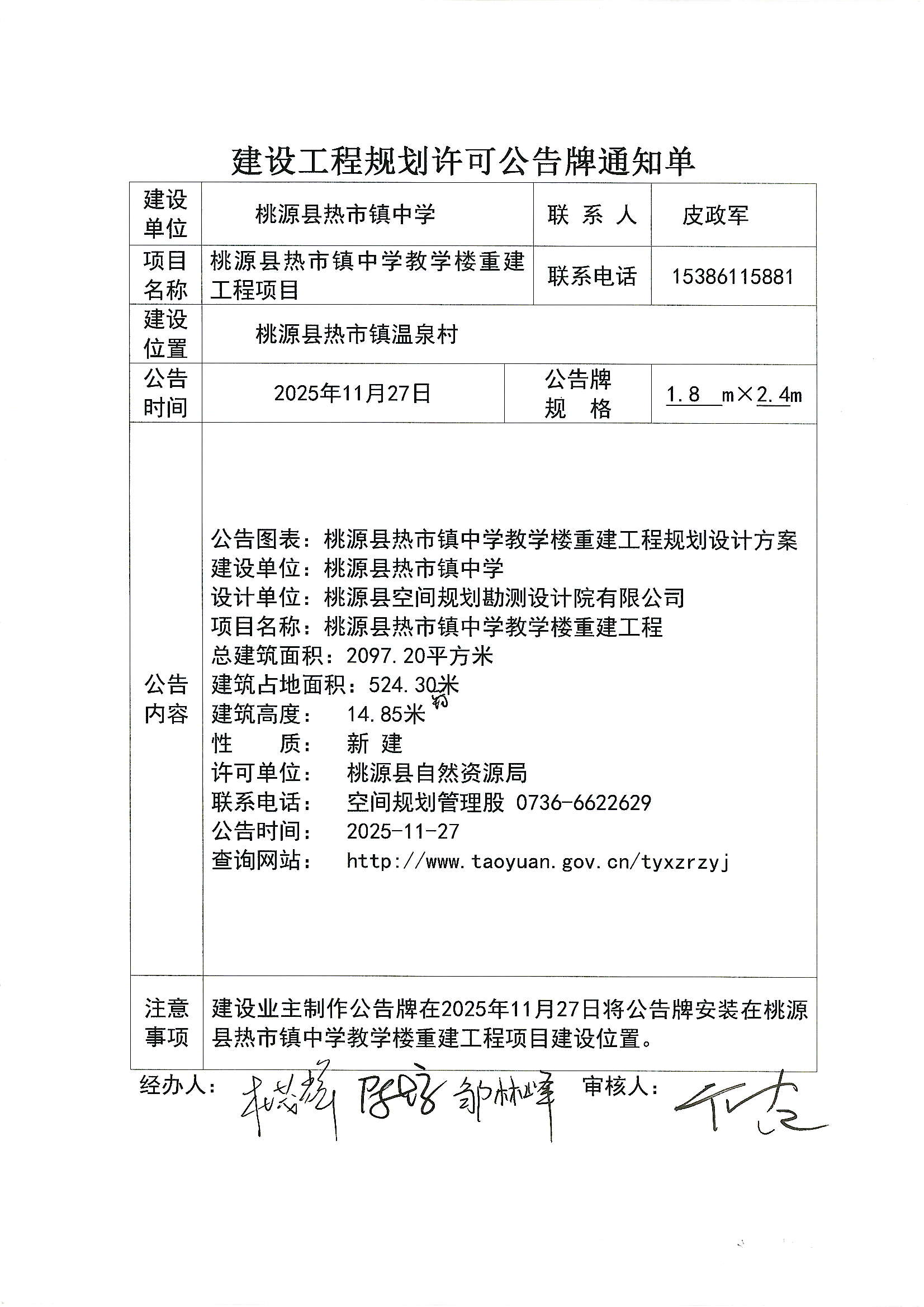 桃源县热市中学教学楼重建项目-建设工程规划许可公告牌公示
