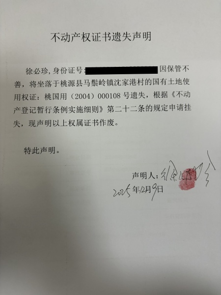 不动产权属证书遗失声明-徐必珍