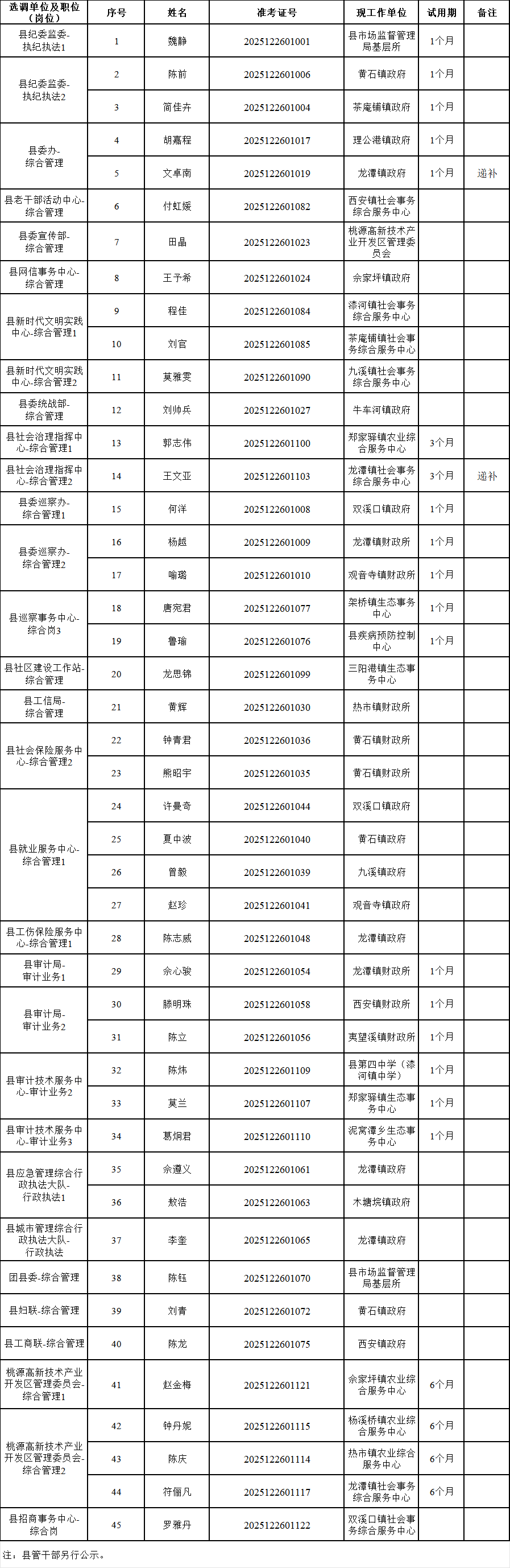 根据《2025年度桃源县县直机关事业单位公开选调工作人员公告》要求,经报名、笔试、资格审查、面试、考察等程序,确定魏静等45名同志为2025年度县直机关事业单位公开选调工作人员拟选调人员,现予以公示。人员名单见下表。