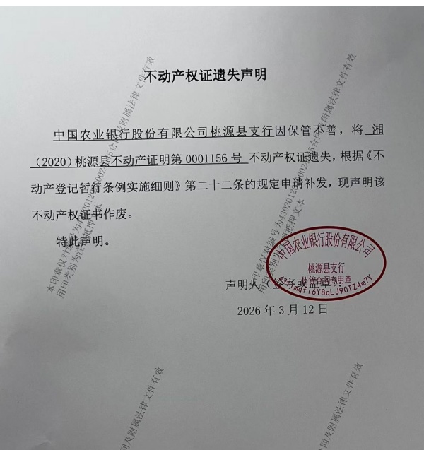 不动产他项权属证书遗失声明-湘(2020)桃源县不动产证明第0001156号