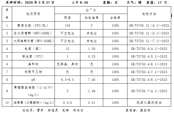桃源县城区2026年3月27日水质检测报告