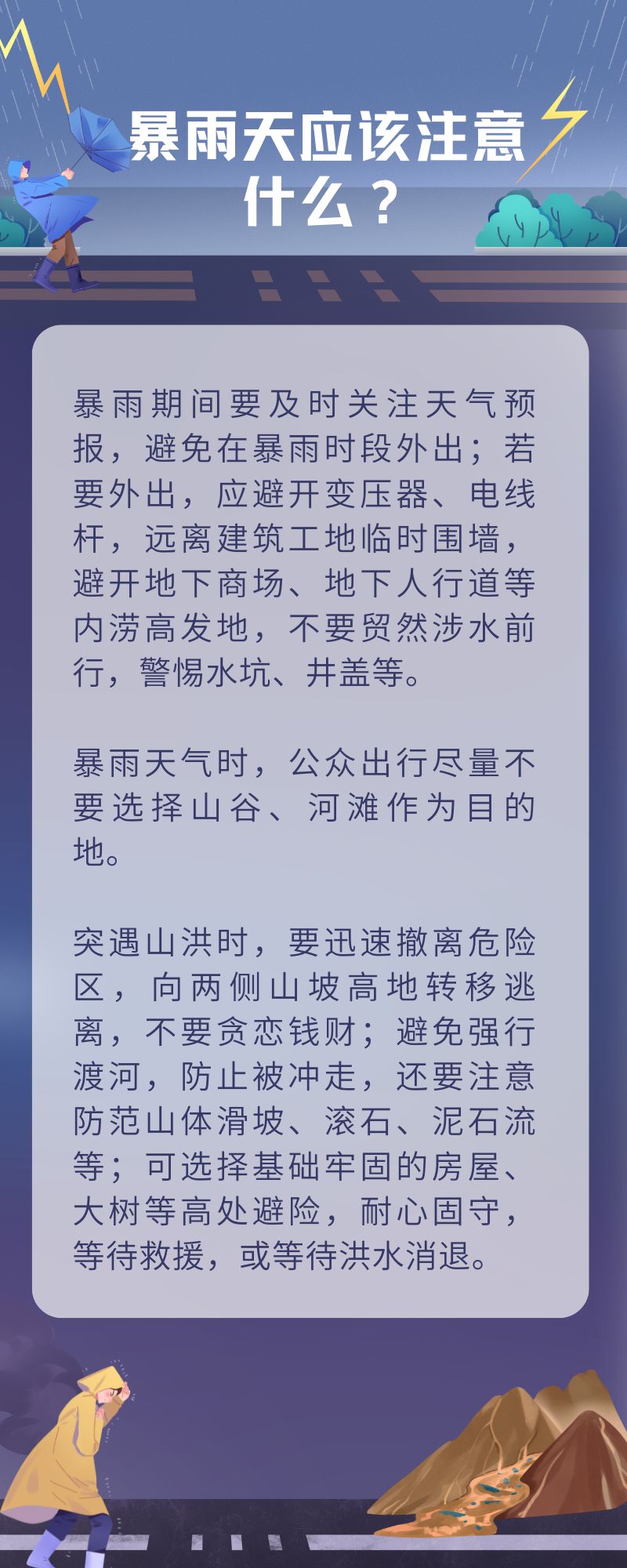 暴雨天应该注意什么?业内专家建议,暴雨期间要及时关注天气预报,避免在暴雨时段外出;若要外出,应避开变压器、电线杆,远离建筑工地临时围墙,避开地下商场、地下人行道等内涝高发地,不要贸然涉水前行,警惕水坑、井盖等。