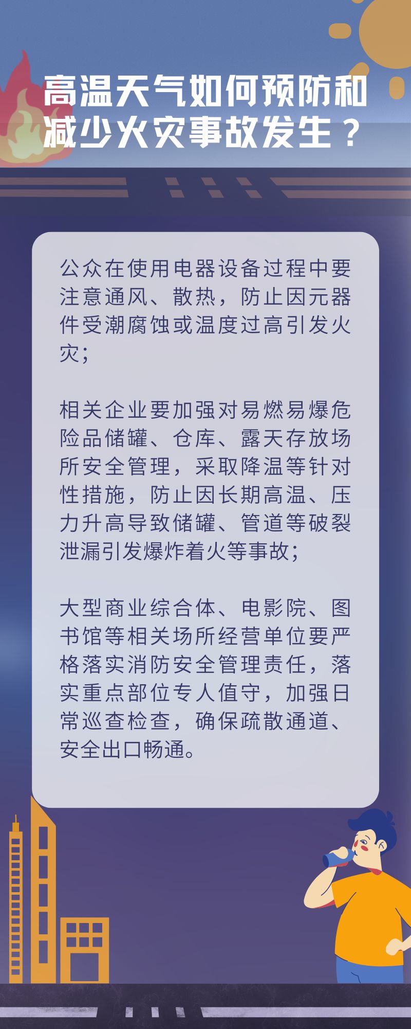 高温天气如何有效预防和减少火灾事故发生?应急管理部消防救援局发布消防安全提示,公众在使用电器设备过程中要注意通风、散热,防止因元器件受潮腐蚀或温度过高引发火灾;相关企业要加强对易燃易爆危险品储罐、仓库、露天存放场所安全管理,采取降温等针对性措施,防止因长期高温、压力升高导致储罐、管道等破裂泄漏引发爆炸着火等事故;大型商业综合体、电影院、图书馆等相关场所经营单位要严格落实消防安全管理责任,落实重点部位专人值守,加强日常巡查检查,确保疏散通道、安全出口畅通。